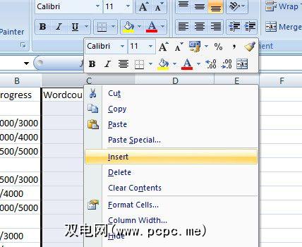 现在是时候使此信息更显眼了。该仪表板的目的是使您可以立即访问一系列高级信息,因此简单的“交通灯"方法非常有效。首先,您需要右键单击包含'Wordcount Progress'的列栏的顶部,然后选择'Insert'以添加一个额外的空白列。
