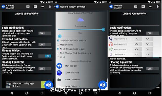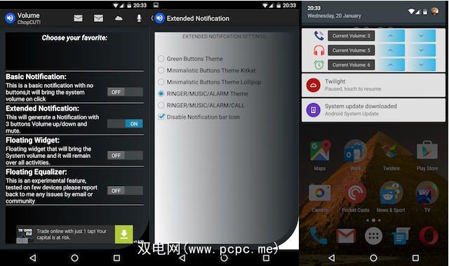 扩展通知。这还将创建一个持久性通知,但带有内置的音量调高和调低按钮。三种不同的主题选项可让您调整当前的应用内声音级别,另外两种可让您访问铃声,音乐,闹钟和通话音量设置的组合。