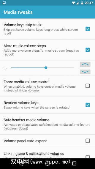 在GravityBox的 Media tweaks 部分中,可以选择一些选项来调整设备的音量控件的工作方式。