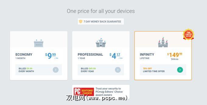 VPN无限提供许多付款级别,重点是每月,每年或一次性终身付款。如果您按年度付款计划订阅该服务,则相当于每月仅$ 3.33。该计划包括最多五台设备的无限VPN使用,这意味着您可以保护台式机,笔记本电脑和移动设备而无需额外付费。
