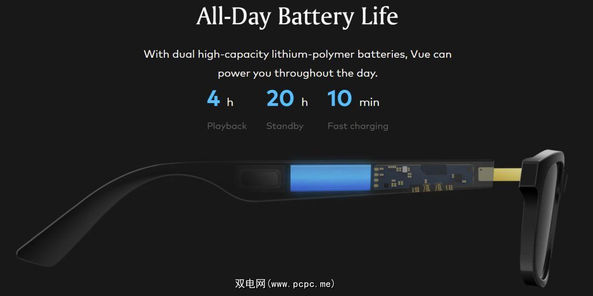 在 Lite 系列中,Vue 去掉了名称中的“智能”部分,引入了更符合人体工程学的设计,并从骨传导切换到内置于眼镜臂的扬声器,这种设计类似于其他“智能”眼镜。这听起来比骨传导迭代更好,但扬声器有其自身的缺点。Vue 还去掉了充电盒,取而代之的是为眼镜配备了磁性充电针,这需要一条专有的充电线来为每个手臂中的微型电池充电。