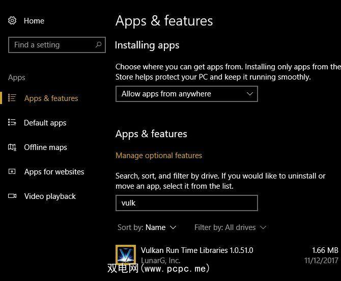 在Windows 10上,打开设置应用,然后选择应用条目。在应用和功能标签上,使用搜索框查找 Vulkan 。如果您看到 Vulkan运行时库条目,则表明它已安装在系统上。