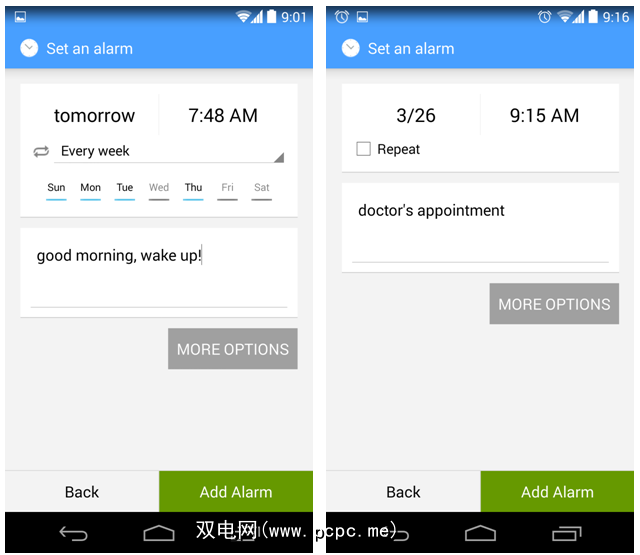 您可以在此处结束整个操作,但是值得更深入地研究并使用AlarmPad的其他选项。首先,您可以在某些天,每天甚至每隔几个小时重复一次闹钟。您可以将闹钟设置为在某个特定日期响起,即使是在未来3个月内也可以。警报标题可以帮助您记住该警报的全部内容,无论是常规警报还是下个月要预约的医生。