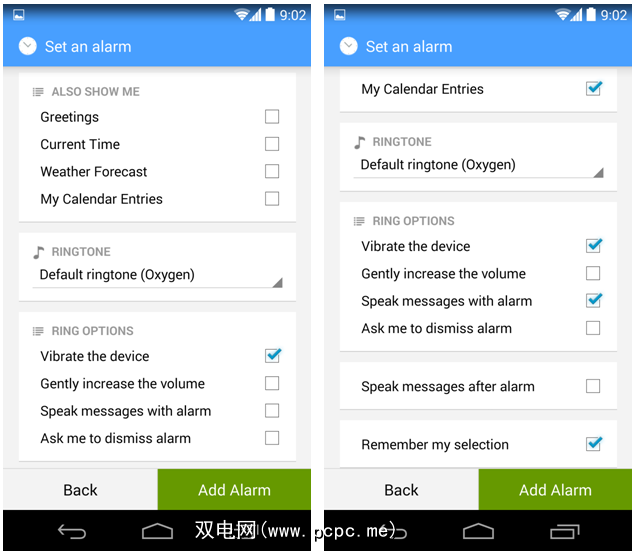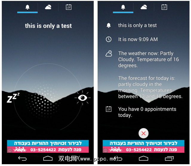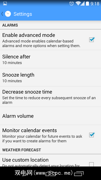 点击“更多选项"按钮。您可以在此处设置AlarmPad来通知您当前的天气以及Google日历中的近期约会。如果需要,AlarmPad甚至可以使用文本朗读功能向您朗读此信息。或者,它只能读出闹钟的标题。它可以做的另一件事是询问您是否要消除警报,您可以使用语音命令对其进行回答。