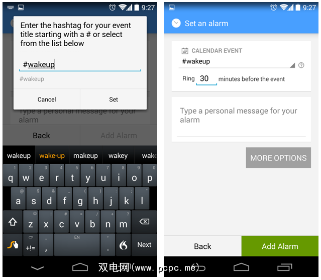 日历警报使用井号来识别日历中的事件。这可以是您梦dream以求的任何主题标签,但您需要将其包含在活动标题中。将事件放置在日历中后,请点击AlarmPad中的日历图标,然后基于该标签创建警报。