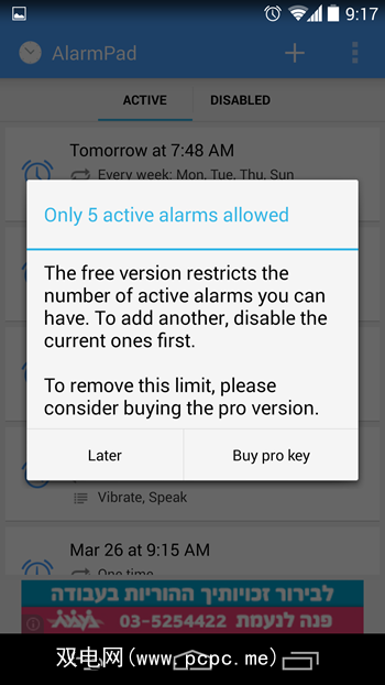 我确定您已经注意到上面截图中的广告。如您所料,您可以通过购买Pro版的AlarmPad摆脱这些麻烦。除了广告外,免费版本还一次将您限制为5个活动警报。