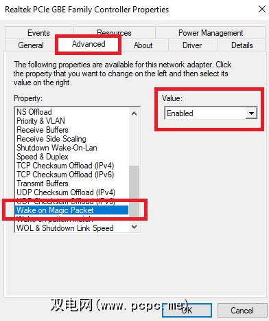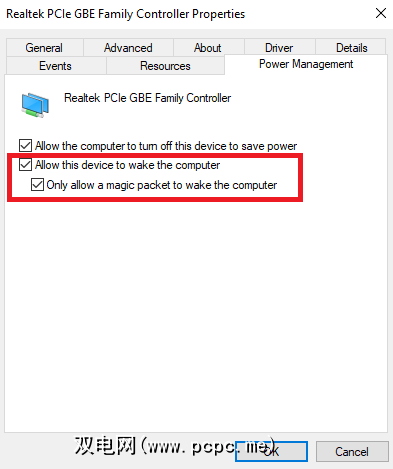 下一步,单击电源管理选项卡。确保选中允许此设备唤醒计算机旁边的两个复选框,并仅允许魔术包唤醒计算机。