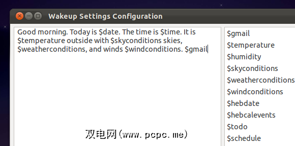在上面的屏幕快照中,您看到的各种单词前面都带有美元符号。这些本质上是命令,使Wakeup可以找到一些可以读取给您的信息。例如:“ $ gmail"告诉您有多少未读电子邮件正在等待您,“ $ temperature"让您知道当前温度。 “ $ todo"和“ $ schedule"从Evolution中提取任务列表和日历。