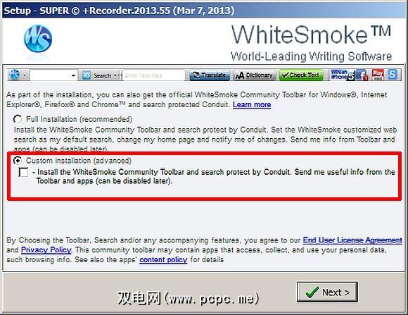 在安装主程序后,您将立即卸载广告软件。截至2013年,您将卸载的两个软件是JollyWallet和DefaultTabSearch。如果您不小心安装了可选软件WhiteSmoke Toolbar,则也应该摆脱它。