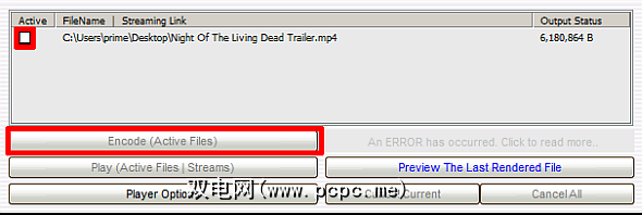 最后,选中活动框,然后按编码(活动文件)按钮。几分钟后,“活动"框将取消选中,这意味着视频已完全处理。