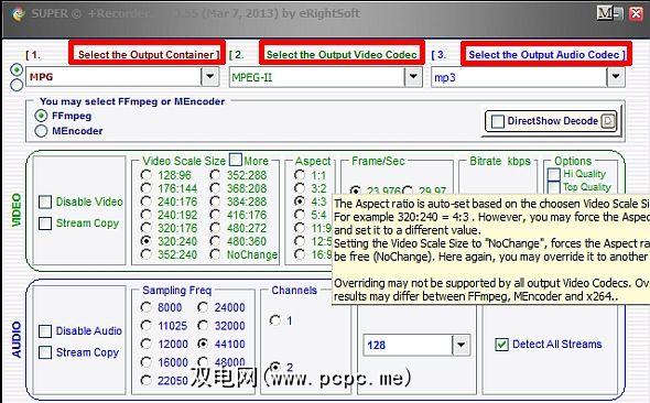 一旦您绕开了载满广告软件的安装,就该开始尝试了SUPER:视频转换。该过程分为五个部分:首先,选择要使用的容器格式;其次,选择视频编解码器;第三,选择音频编解码器;第四,选择视频输出设置;第五,选择音频输出设置。
