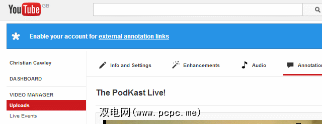 验证您的网站后,打开视频管理器。在屏幕顶部,您应该看到一个吐司通知,用于为您的帐户启用外部注释链接。点击启用,然后点击上传。在这里,选择要添加链接的视频,然后从菜单中选择注释。