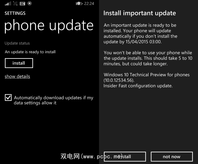 点击检查更新和下载以开始下载更新。下载更新后,将手机连接至充电器,然后点击安装。成功安装后,将提供第二个更新。您必须同意这一点,因为这是移动设备的实际Windows 10技术预览版。在整个更新过程中,手机将重新启动几次。不用担心,这完全正常,这就是为什么我们使用充电器保持电源接通。