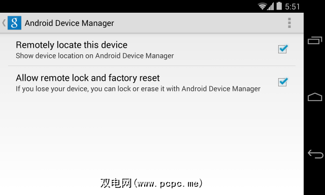 要进行设置,请在Android设备上打开应用程序抽屉,然后启动Google设置应用程序。点按“ Android设备管理器"并启用“远程定位此设备"选项。如果您想要远程锁定或恢复出厂设置的功能,也可以启用此选项。