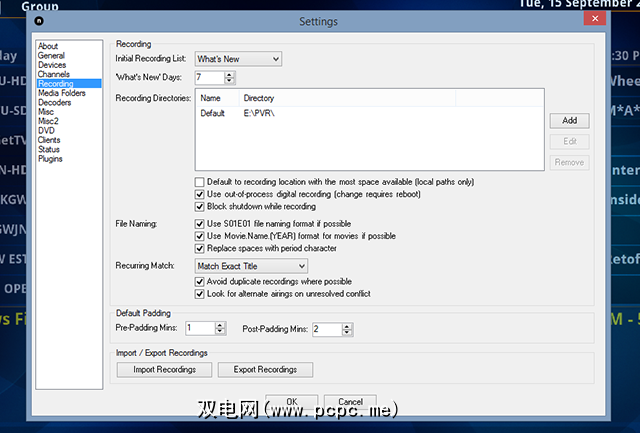 默认情况下,您的记录最终存储在C:\驱动器上,因此,如果要使用其他驱动器,请务必进行更改。您还可以在 Misc 标签上选择直播电视缓冲区的存储位置。