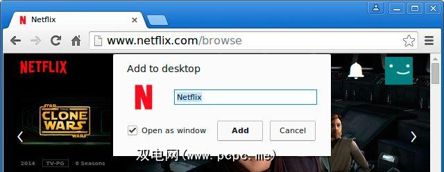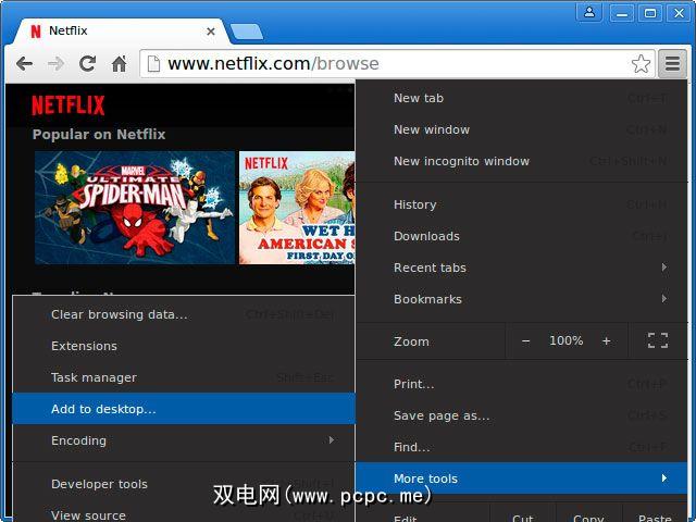 正如我在本文前面所述,您可以通过Google Chrome的“添加到桌面"功能在Linux上创建桌面应用程序,这是执行操作的方法。这个过程非常简单而且非常直接,因此首先只需在Google Chrome浏览器中访问Netflix.com。进入首页后,您无需登录,但是如果需要可以单击Chrome浏览器右上方的 Hamburger 图标。汉堡图标可能看起来很奇怪,这是因为它很奇怪,但这是3横线图标的昵称,如今这些图标变得越来越流行。接下来将鼠标悬停,或使用键盘选择更多工具选项以显示其他菜单。在“更多工具"菜单中,单击添加到桌面选项以开始创建应用程序。