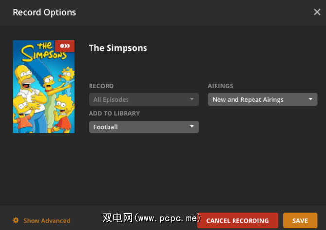 对于电视节目,Plex将允许您录制该节目的一个特定情节或所有情节。 。您还可以设置是否要重新播放和重复播放,以及要存储哪个库。点击显示高级,查看Plex如何真正发挥作用。您可以调整的一些高级录制设置包括: