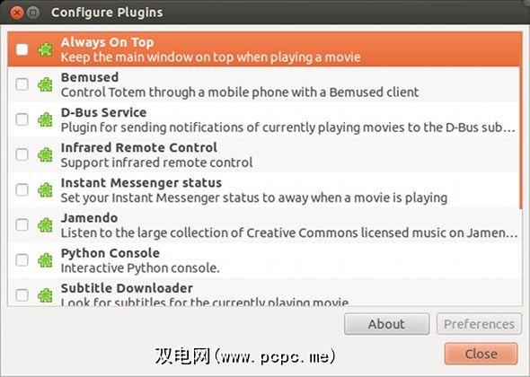 Totem还支持多种插件,其中许多插件是在安装Totem时自动提供的。一些著名的插件包括根据当前播放的内容更改即时消息状态的功能,YouTube浏览器,对Jamendo的支持,缩略图,对Zeitgeist的支持以及Bemused功能(可让您从移动设备控制Totem)。