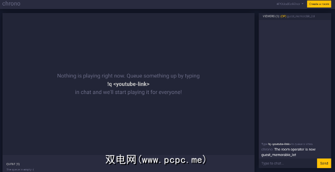 每个参与者(包括您,主持人)都将自动分配一个随机昵称。在单独的标签中搜索YouTube视频,复制链接,然后将其粘贴到Chrono Tube中并添加!q。该应用程序将立即开始在聊天室中播放视频,以供所有人查看。任何参与者都可以继续添加更多链接来创建播放列表。