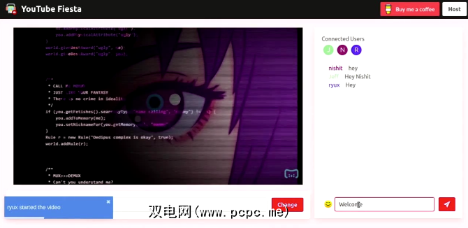 YouTube嘉年华只有带有表情符号的文字聊天才能相互交流。添加新的YouTube链接,然后点击“更改"按钮以开始新的视频。您可以选择是由任何人控制回放还是由主机控制。没有播放列表,没有队列,没有头痛; YouTube嘉年华的简单性是最大的吸引力。