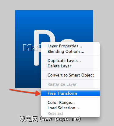 如果要旋转水印以在图像上对角显示,请选择选取框工具,右键单击文本并选择免费 Transform 。