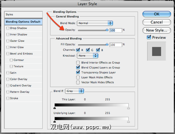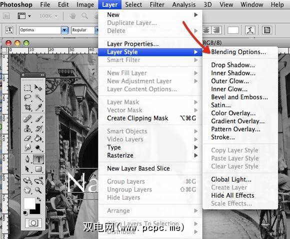 确定了文本的大小和位置之后,您可能需要文字不透明。转到图层>图层样式>混合选项。