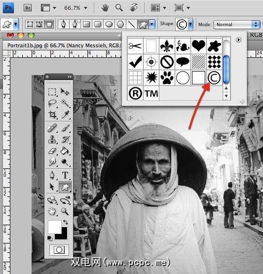 使用在Photoshop形状下找到的版权符号,您可以创建一个非常简单的水印,从而可以保护整个图像。当然,可以用您选择使用的任何其他形状代替该符号。