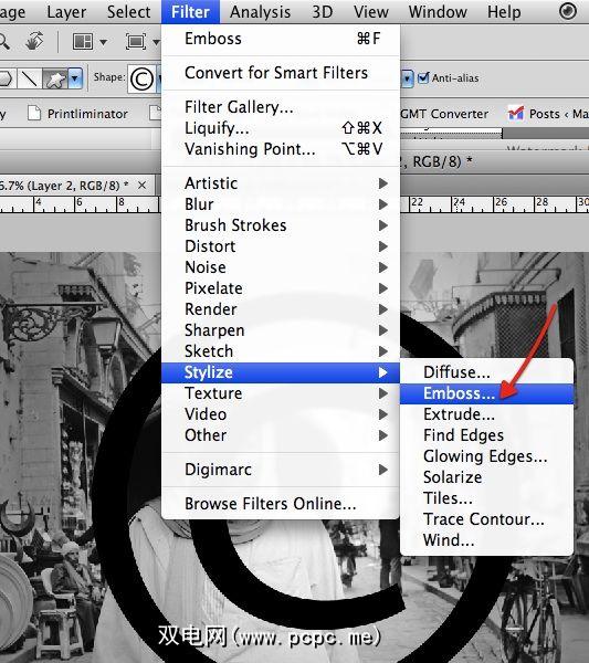 另一种方法是使用黑色作为颜色创建形状,然后对形状应用 Emboss 滤镜。在图像上绘制形状后,转到过滤器>样式化>浮雕。