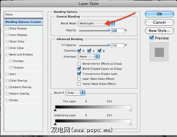 下一步,进入“图层样式",然后从“混合模式"下拉菜单中选择“ 硬光"。