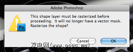 当Photoshop询问您是否要光栅化形状时,请单击确定