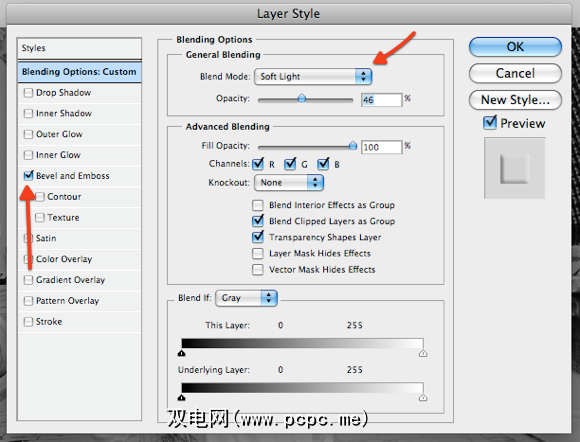 将符号用作水印时,请使用附加的混合选项坚强>才能真正栩栩如生。例如,使用版权符号,从下拉菜单中选择“柔光",并确保选中斜角和浮雕。
