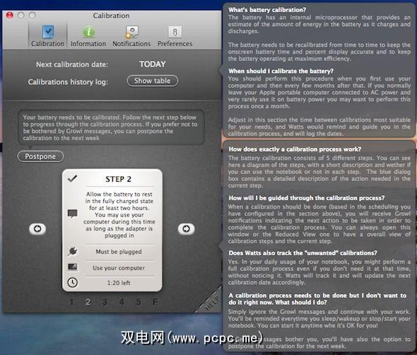 您可以继续工作直到笔记本电脑进入睡眠状态,Watts会通过Growl提示您,以提醒您继续进行下一步,保存您的工作并为睡眠步骤做准备。瓦特中的帮助详细信息会向您说明校准的每个步骤中发生的情况,为什么有必要,并向您保证可以推迟校准。