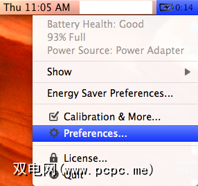 瓦特在菜单栏中运行,显示电池电量和运行状况,也可以在其中单击电池图标访问“瓦数"菜单。如果您希望在菜单栏中节省空间,那么只要您选择在启动时运行瓦特,则瓦特电池图标可以替换Mac电池图标。