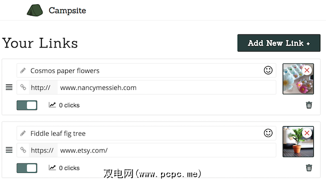 点击添加新链接,然后点击图片缩略图。这将加载您的最新Instagram照片列表。单击要使用的图像,之后可以添加链接和该链接的文本。 Campsite还将提供链接点击的基本分析。
