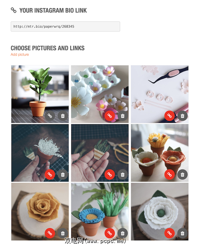 您将看到Instagram图片的供稿。只需点击红色超链接按钮即可为该图像添加链接。在页面顶部,您将找到要插入到Instagram简历中的Metricool URL,并在照片共享应用程序上将人们引导至该URL。
