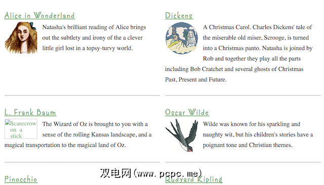 Lit2Go是一个插图精美的网站,该网站的叙述者阅读了有声读物。每个故事章节都有自己的直接MP3文件,流音频播放器和PDF文件。该页面还为您提供了有关这本书的更多详细信息,例如出版年份,字数和“弗莱施—金开本水平"。