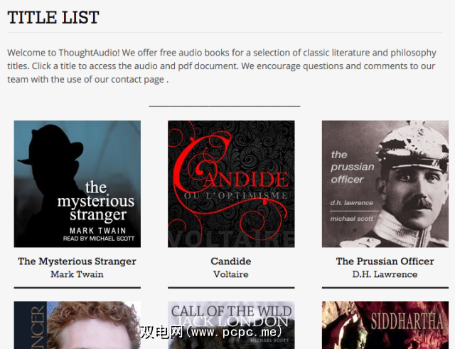ThoughtAudio提供了很多不错的书籍,这些书籍在此列表的其他站点上并未真正出现。另外,他们不会像其他一些网站一样从Librivox删除下载内容,而是自己制作有声读物。它们还会产生正在阅读的书的非常好的“成绩单",因此您可以继续阅读。