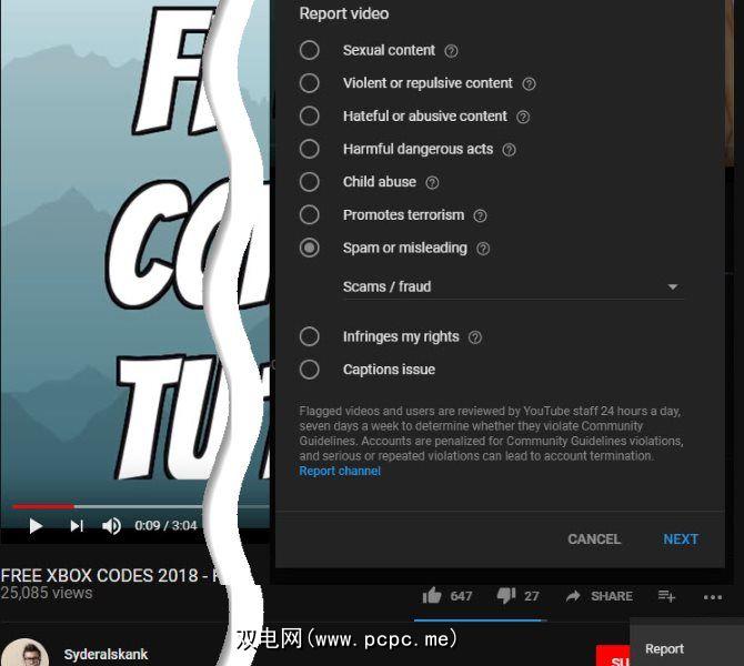 在任何视频上,您都可以单击三点菜单按钮,然后选择报告。然后选择违反的条件,YouTube工作人员将检查该标志以确定它是否合法。