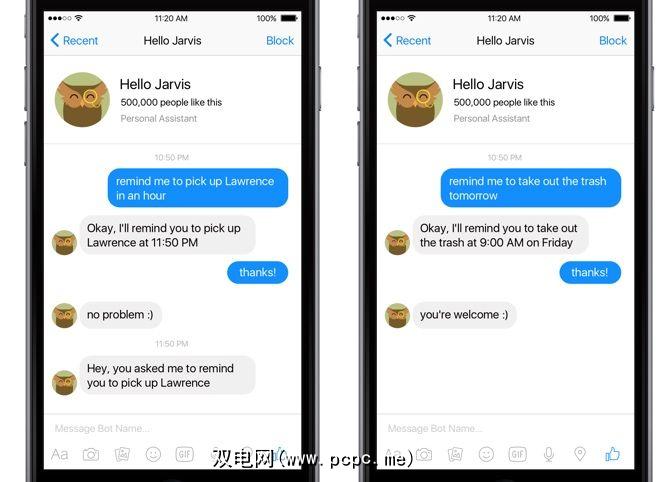 4。 Jarvis Bot(Facebook):来自Facebook的提醒