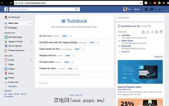 最新的生产力工具是ToDoBook,它具有解决Facebook问题的简单但有效的方法。 ToDoBook是一个Chrome扩展程序,可将您的新闻订阅源替换为任务列表。您必须手动添加任务,并在完成任务时将其选中。完成列表后,您将再次看到新闻源。