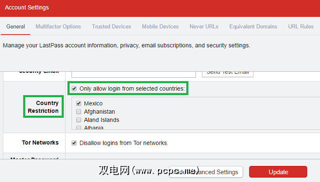 您可以轻松地阻止从特定国家/地区登录。要启用该功能,请转到帐户设置>常规>显示高级设置>安全>国家/地区限制。选中您要允许的国家旁边的复选框。