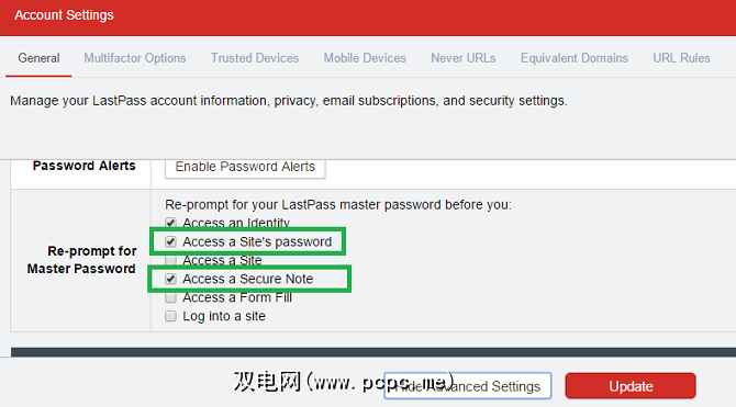 转到帐户设置>常规>显示高级设置>警报>重新提示输入主密码,然后选中访问站点密码和访问安全说明旁边的框。