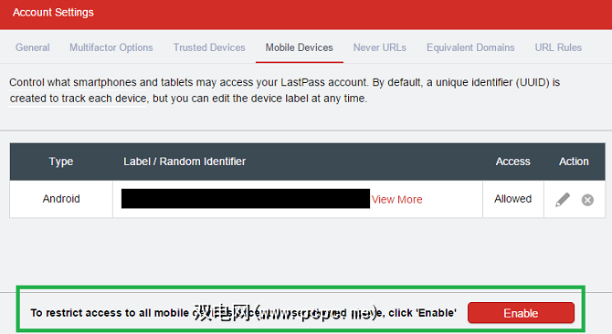 删除您不认识或不再使用的任何设备,然后单击启用< 要限制对除上面允许的设备之外的所有移动设备的访问,请单击“ / strong>"按钮。
