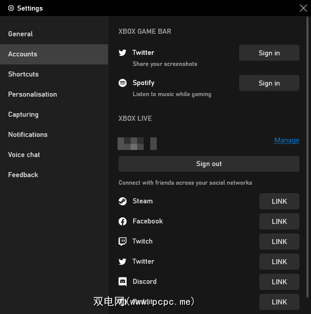 在此之下,您会找到 Xbox Live 部分,您可以通过该部分进行链接来自Steam和Facebook等服务的帐户,因此您可以与在那里使用Xbox Live的朋友联系。