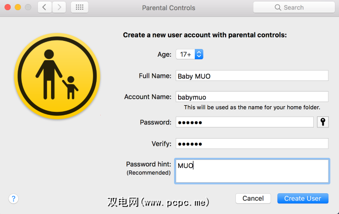假设您是Mac上的唯一用户,那么您会看到一条注释,指出没有用户帐户可以管理。实际上,家长控制仅适用于非管理员帐户。因此,您需要使用家长控制来创建一个新的用户帐户,或者将您自己的帐户转换为受控帐户。