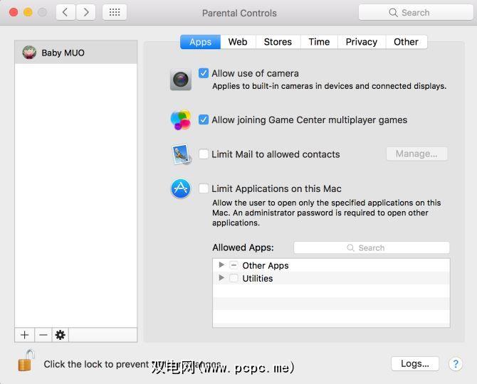 无论出于何种原因,都可以限制允许帐户在 Apps 标签。选中在此Mac上限制应用程序,您可以手动选择允许的应用程序。系统会在其他应用下为您检查一些基本知识,例如应用商店,计算器和 iMovie 。但是您可以进行任何更改-如果您在列表中找不到该应用,请使用附近的框搜索该应用。