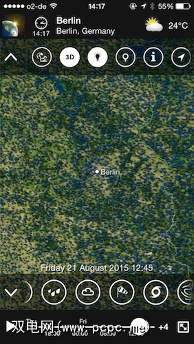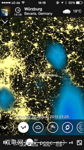 时间轴涵盖了接下来的24小时,并且在屏幕底部选择了天气状况后,您可以点击时间轴上的播放按钮。然后,您会看到特定的天气状况在您的位置上移动(如果没有预测,则不会移动)。不过,您一次只能选择一个,因此无法同时覆盖雨天和云层。