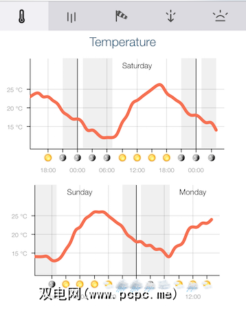 想知道特定日期和时间的天气情况吗?只需将指针放在模拟表盘上的正确日期,您将获得长达7天的预测。您可以看到预测的温度,风力,下雨或降雪的几率以及整体状况(降雨,晴天,阴天等)。