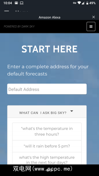 要获得更好的天气体验,您需要使用BigSky技能。它由“黑暗的天空"技术提供支持,该技术是移动设备上的热门气象服务。这将帮助您获得对地址而不是整个城市的预测。