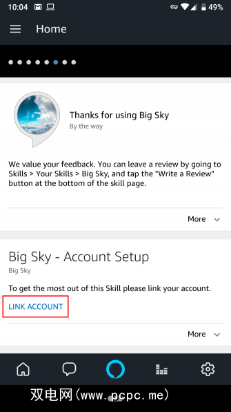 要安装该地址,请在其桌面页面上点击启用技能,或说出 Alexa,启用大天空。完成此操作后,您需要先关联您的帐户,然后该帐户才能正常运行。